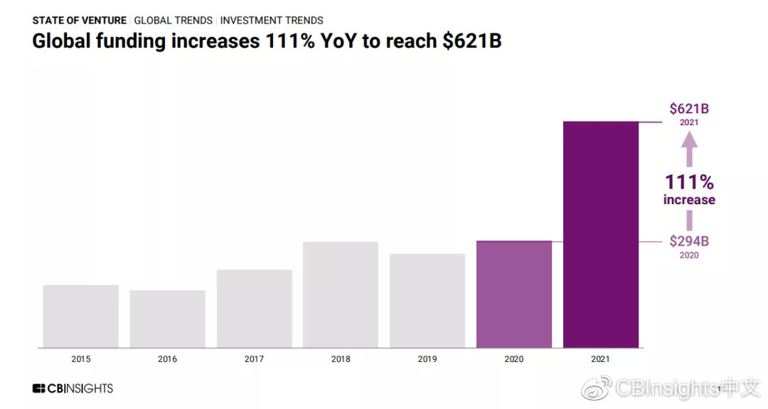 在各國(guó)央行史無前例的寬松貨幣政策與過剩的流動(dòng)性趨勢(shì)下,疫情并沒有阻礙 2021 年風(fēng)投腳步。2021 年全球融資達(dá) 6210 億美元,較 2020 年的 2940 億美元增長(zhǎng)逾一倍。