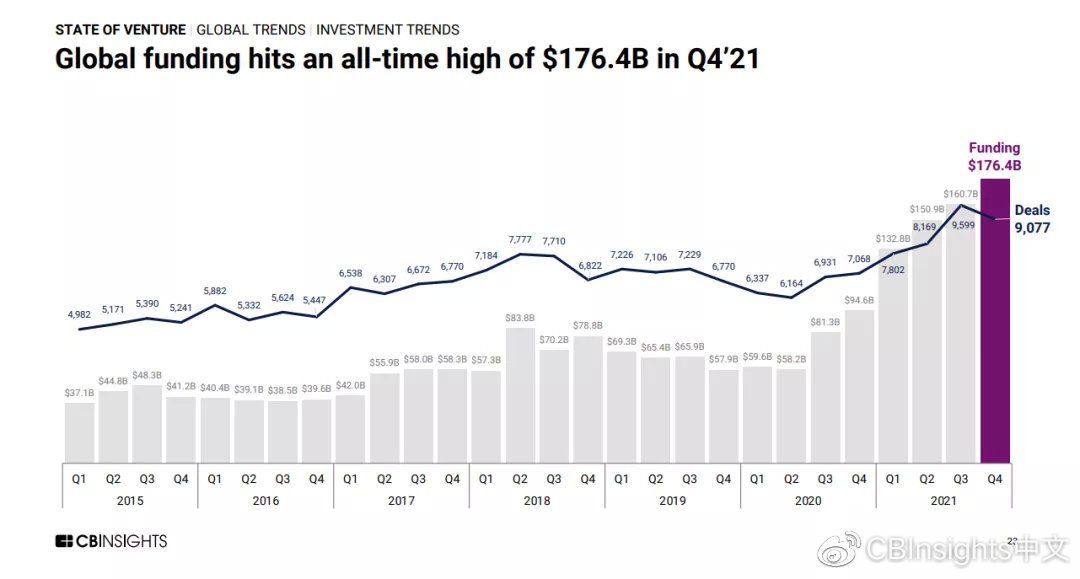 2021 年 Q4 以 1764 億美元投資金額完美收官,這是自 2020 年 Q3 以來投資金額連續(xù)第六個(gè)季度實(shí)現(xiàn)正增長(zhǎng)。