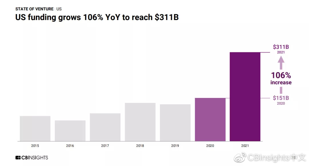 圖 | 2015 年至 2021 年美國(guó)融資金額變化(來源:CB Insights)