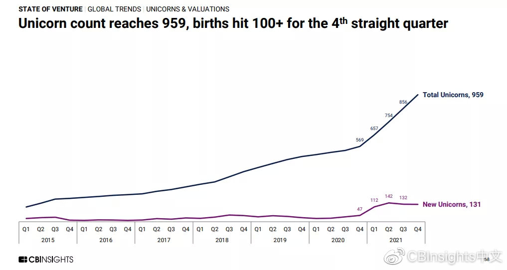 2021 年 Q4 新晉 131 家獨(dú)角獸公司,史上排名第三,僅次于 2021 年 Q2(142 家)以及 2021 年Q3(132 家)。
