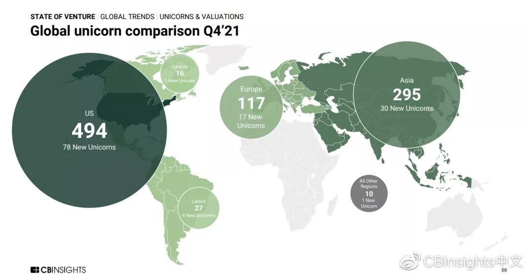 截至 2021 年,全球范圍內(nèi)獨(dú)角獸企業(yè)共計(jì) 959 家。美國(guó)地區(qū)位居首位,有 494 家獨(dú)角獸;亞洲緊隨其后,有 295 家獨(dú)角獸。