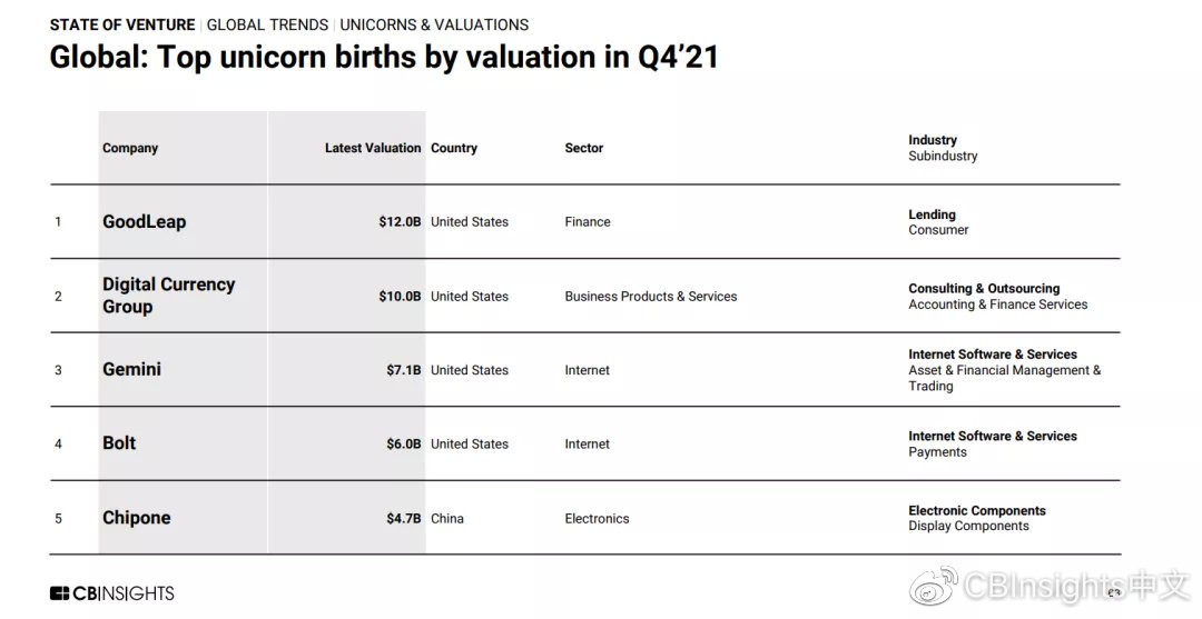 Q4 新晉獨(dú)角獸中,估值最高的 5 家公司分別是美國(guó)金融公司 GoodLeap、美國(guó)數(shù)字貨幣集團(tuán) Digital Currency Group、美國(guó)資產(chǎn)交易平臺(tái) Gemini、電子商務(wù)支付服務(wù)商 Bolt 以及中國(guó)芯片設(shè)計(jì)公司 Chipone(集創(chuàng)北方)。