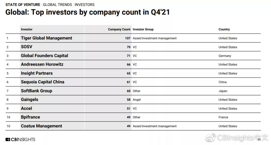 圖 | 2021 年全球最活躍的十大投資機(jī)構(gòu)(來源:CB Insights)