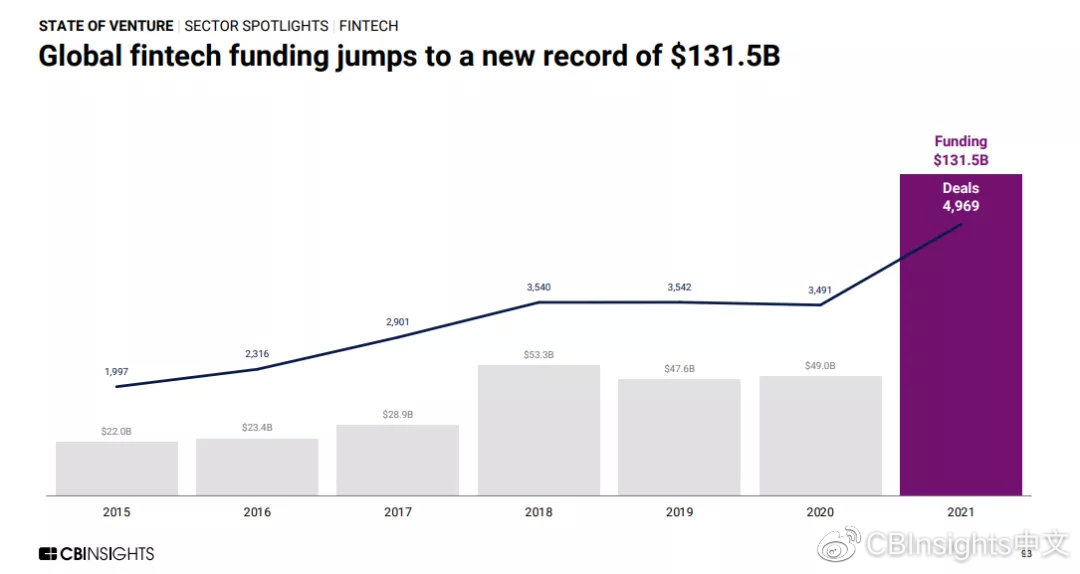 2021 年 Fintech 領(lǐng)域通過 4969 筆交易完成 1315 億美元的融資,融資交易量和融資金額均創(chuàng)下新高。