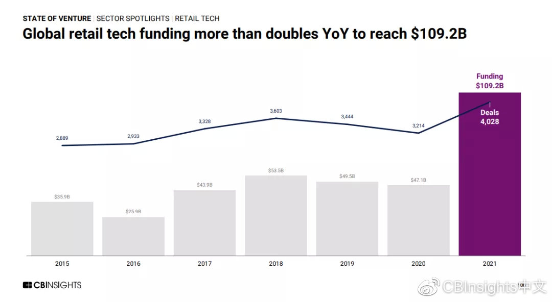 2021 年零售科技領(lǐng)域共完成 4028 筆融資交易,融資金額達(dá)到 1092 億美元,是 2020 年融資金額的兩倍多。