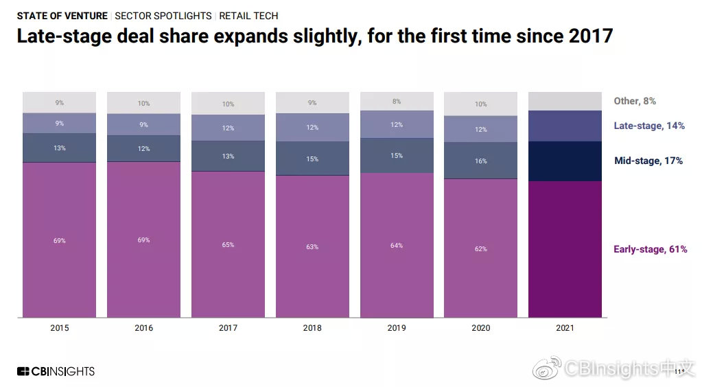 圖 | 2015 年至 2021 年零售科技領(lǐng)域融資交易各階段占比(來源:CB Insights)