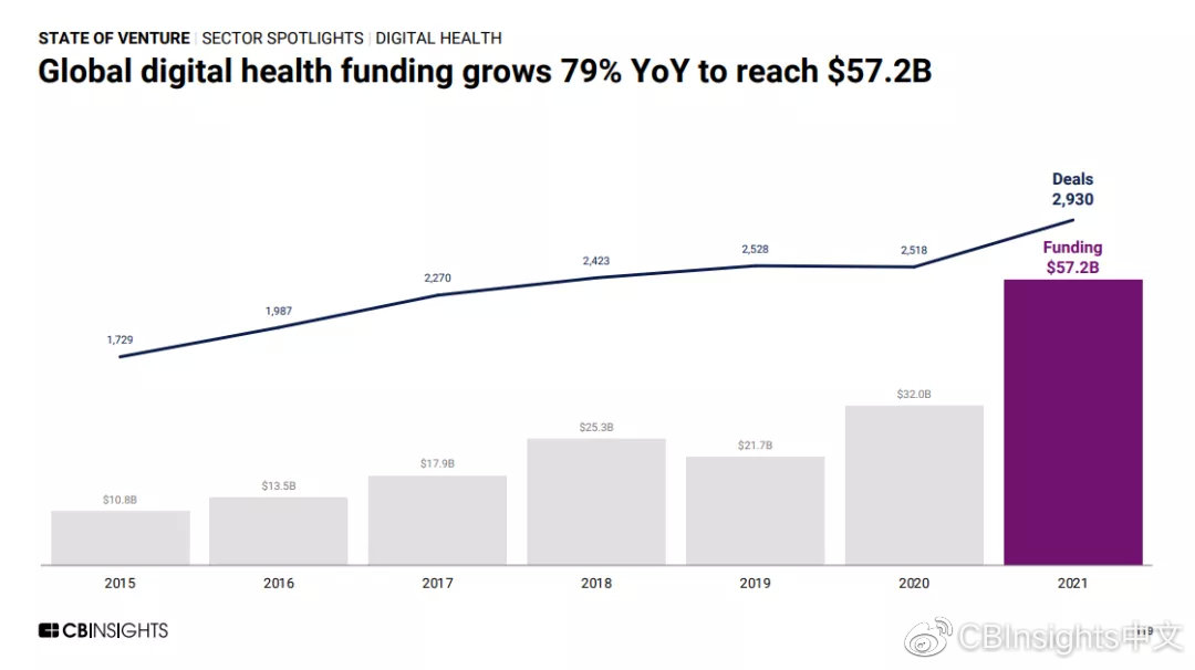 圖 | 2015 年至 2021 年數(shù)字健康領(lǐng)域融資數(shù)量和融資金額(來源:CB Insights)