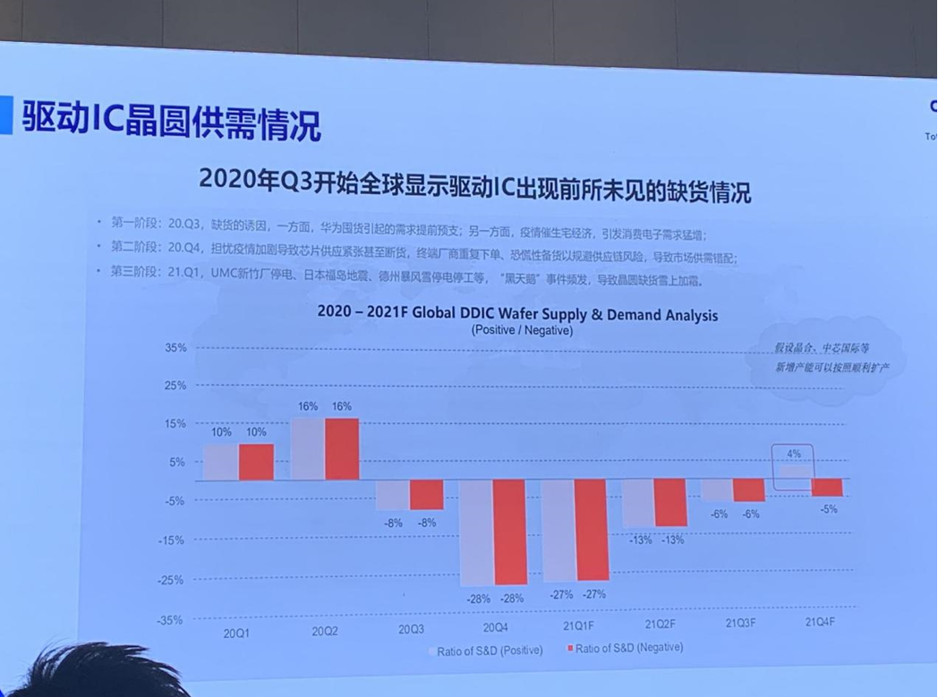 其次,耿俊成總經(jīng)理對(duì)驅(qū)動(dòng)IC晶圓的供需情況進(jìn)行了分析。他認(rèn)為,2020年三季度開(kāi)始全球顯示驅(qū)動(dòng)IC出現(xiàn)了缺貨情況,本次缺貨到目前可以分為三個(gè)階段。第一階段是2020年三季度,缺貨初現(xiàn)端倪。第二個(gè)階段是2020年四季度,恐慌性備貨以規(guī)避供應(yīng)鏈風(fēng)險(xiǎn),導(dǎo)致市場(chǎng)供需錯(cuò)配。第三階段是2021年一季度,UMC新竹廠停電、日本福島地震、德州暴風(fēng)雪停電停工等黑天鵝事件導(dǎo)致晶圓缺貨加劇。