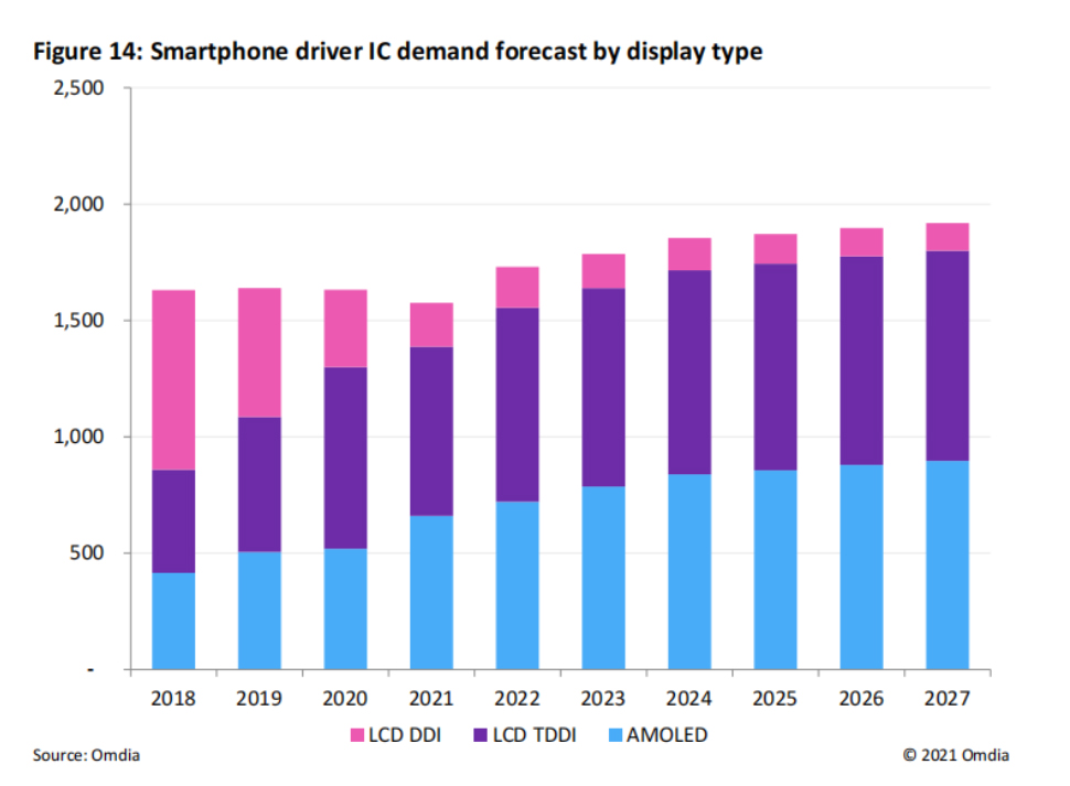 TDDI方案因架構(gòu)的高度集成性,具有顯示屏輕薄化,降低成本,簡化供應鏈等優(yōu)勢,成為了目前手機LCD屏的主流方案,從2020年LCD TDDI方案在智能手機顯示觸控應用占比已超過50%。