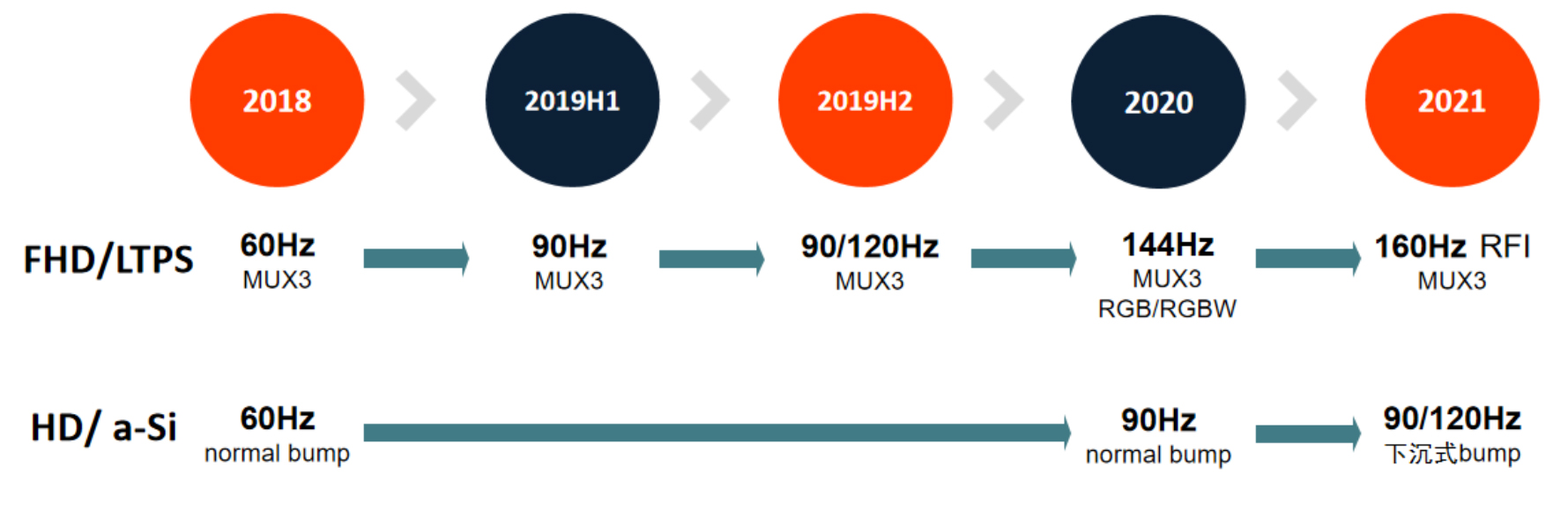 HD a-Si TDDI已實現(xiàn)90Hz量產(chǎn),新開下沉式bump ic已可支援120Hz,針對HD 120Hz規(guī)格顯示屏已不是瓶頸且沒有成本的增加,待有成本匹配的主板套片,終端對應規(guī)劃開案,HD也將有可能升級為120Hz。