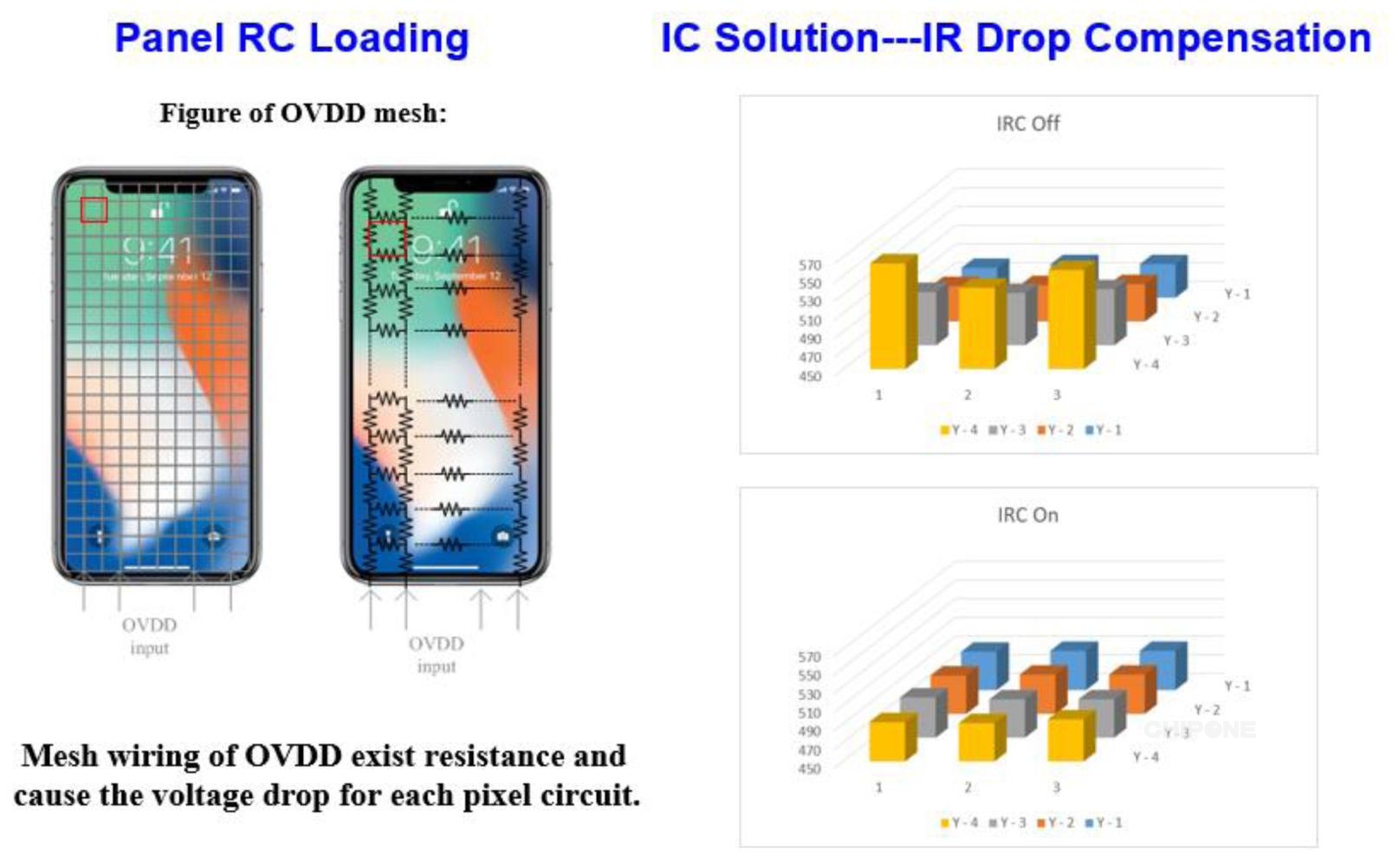 針對TFT背板技術(shù),IC可以提供IR drop Compensation的補(bǔ)償算法技術(shù),用于補(bǔ)償面板內(nèi)部由于金屬走線過長而造成的面板走線的電阻過大,從而引起電流衰減的問題。