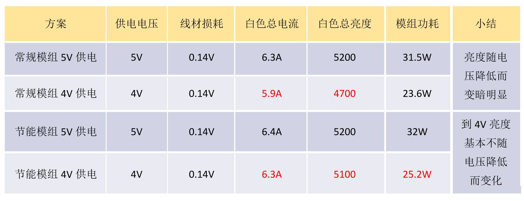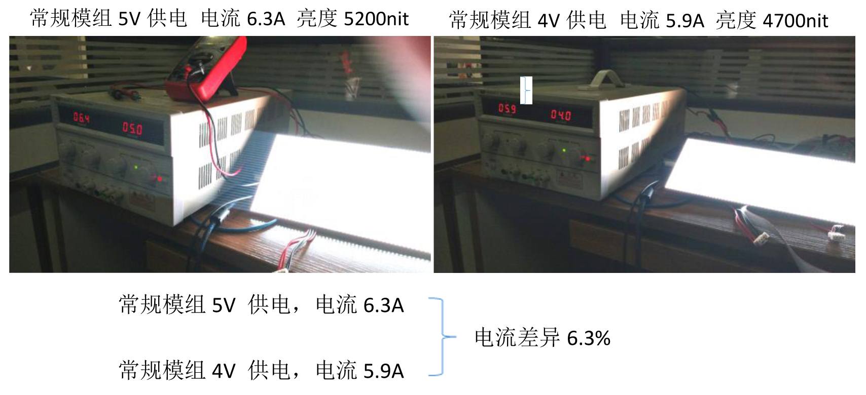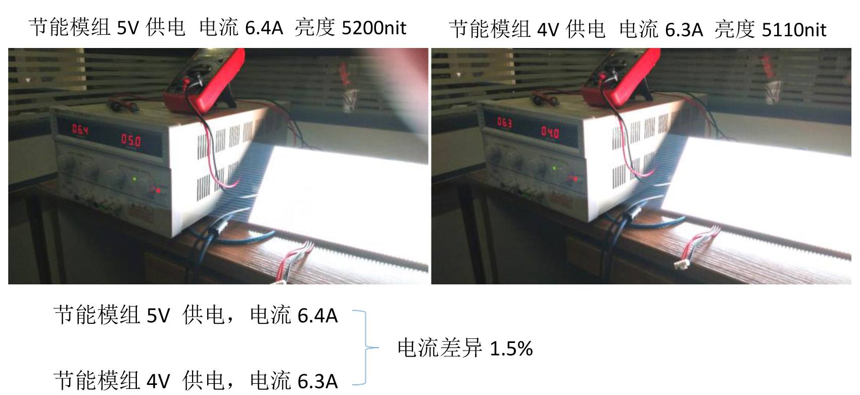 經(jīng)測試P5和P8的模組均可使用4V電壓供電保證模組電流、亮度、顏色無變化,實測節(jié)能比例可達21%。