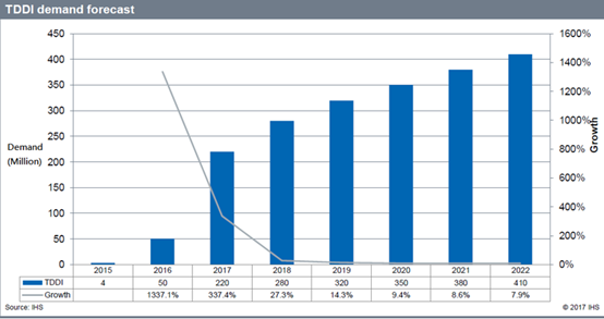 過(guò)去因 TDDI IC 單價(jià)偏高,導(dǎo)致整體 In-Cell 面板模組報(bào)價(jià)居高不下,但隨著面板廠與 IC 設(shè)計(jì)廠商持續(xù)針對(duì)產(chǎn)品進(jìn)行優(yōu)化,TDDI IC 降價(jià)速度加快,也可望加速提升整體 In-Cell 的滲透率。預(yù)計(jì) 2018 年, In-Cell 方案的滲透率將達(dá) 37.6%,其中搭載 TDDI IC 的 In-Cell 產(chǎn)品比重也有機(jī)會(huì)提升至 22%。