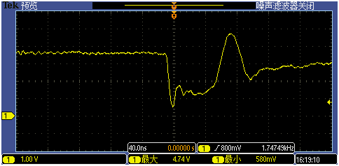 黃色波形為ICN2038,藍(lán)色波形為友商產(chǎn)品。友商產(chǎn)品開關(guān)噪聲,容易導(dǎo)致更大的電源紋波。