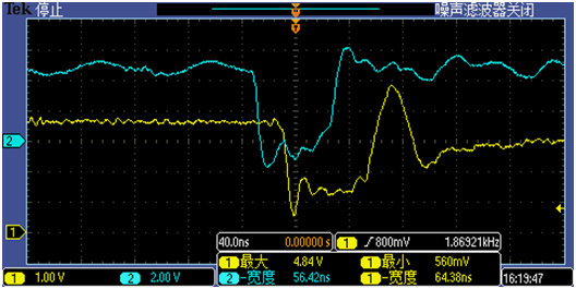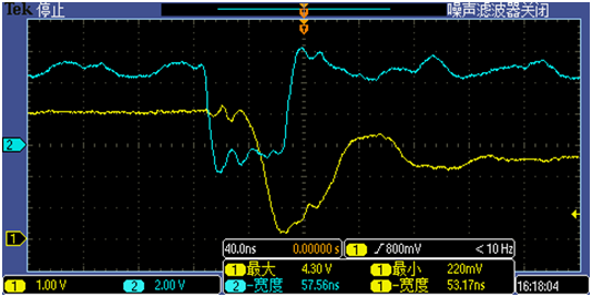 ICN2038測(cè)得打開寬度53ns,友商產(chǎn)品打開寬度64ns。友商產(chǎn)品通道關(guān)閉過沖更高。